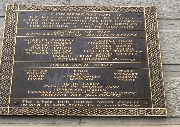 the West entrance to City Hall. This plaque honors the Irish participation in