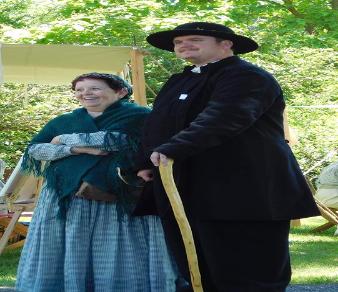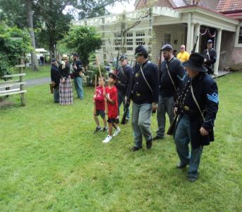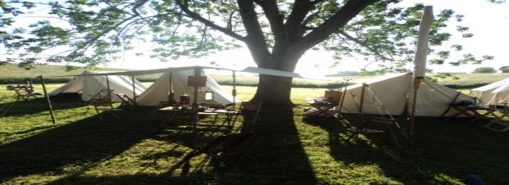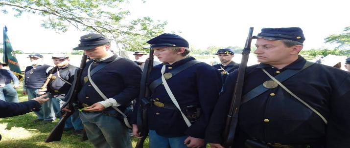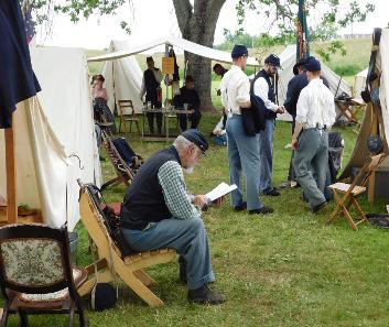 recruits and friends together beneath the shade of the trees. Reenactments are both