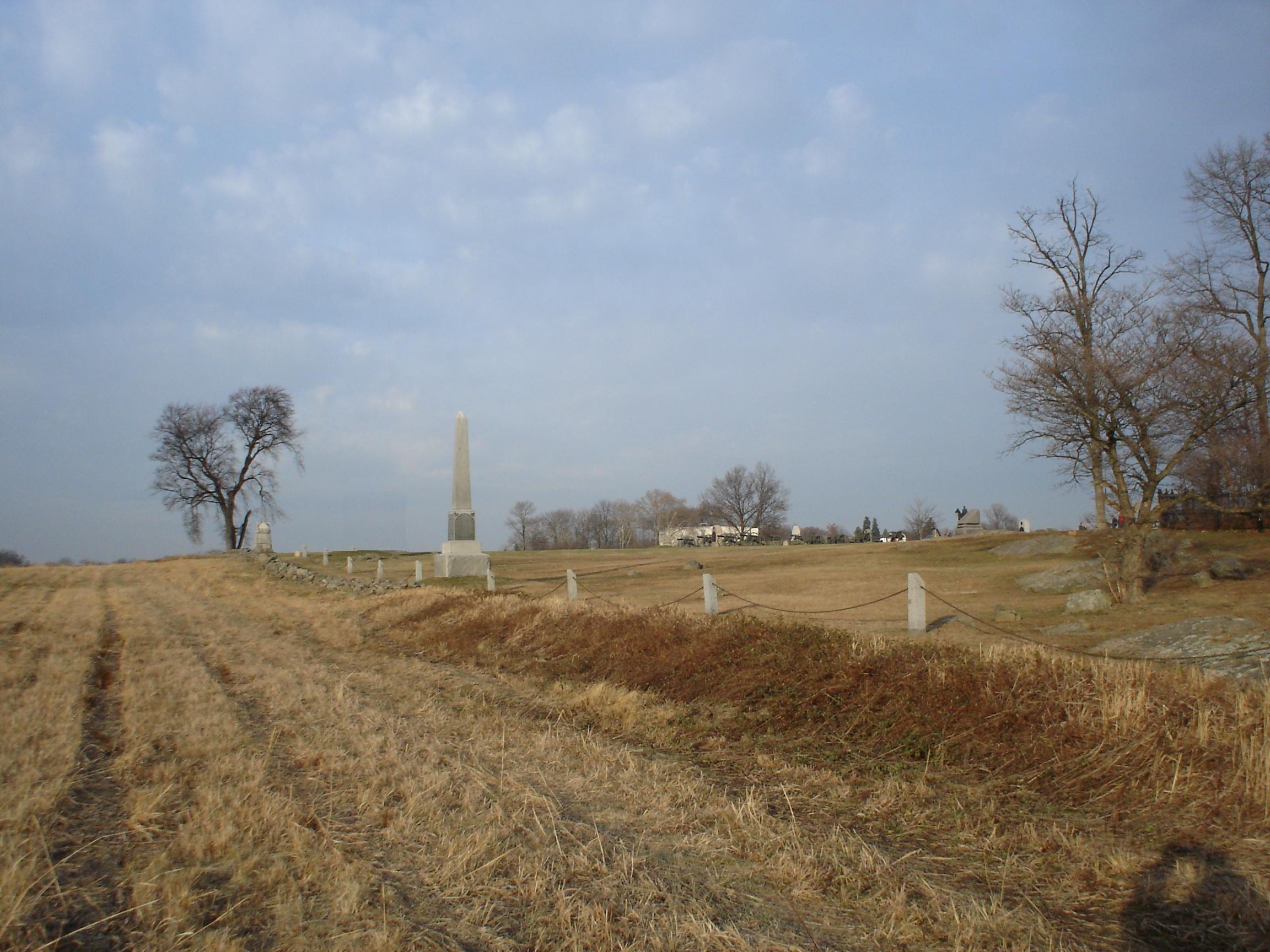 The stone wall behind which the 69th fought the attack of Pickett's Division. Today ten stone markers joined by chains mark the position of each of our companies that day
