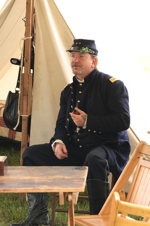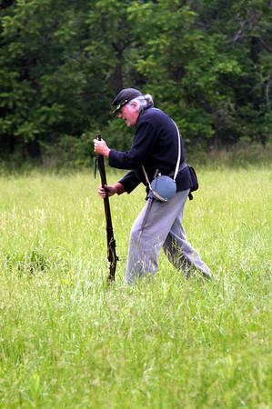 Wounded in the leg, Private Ernsberger limps from the battlefield