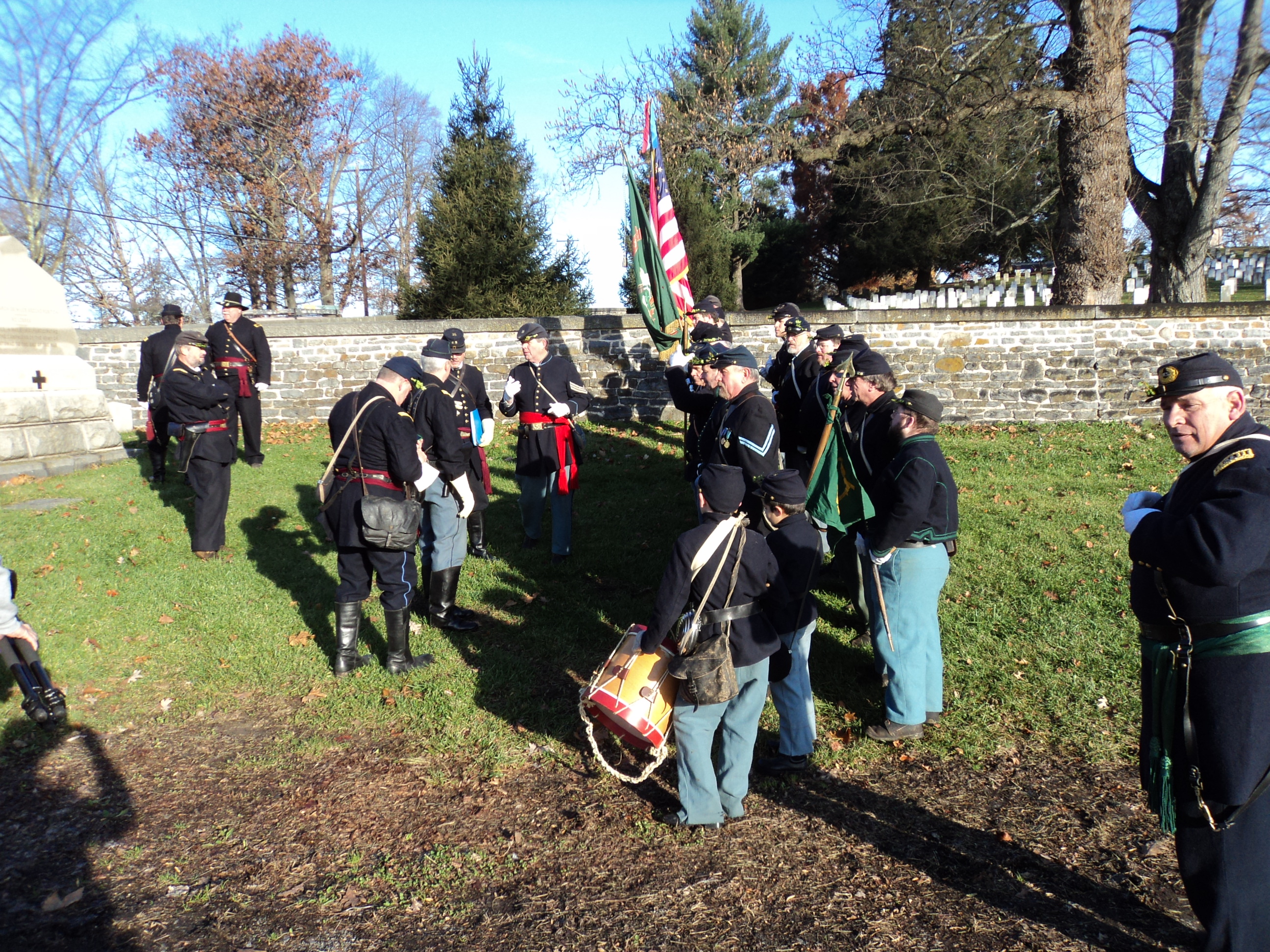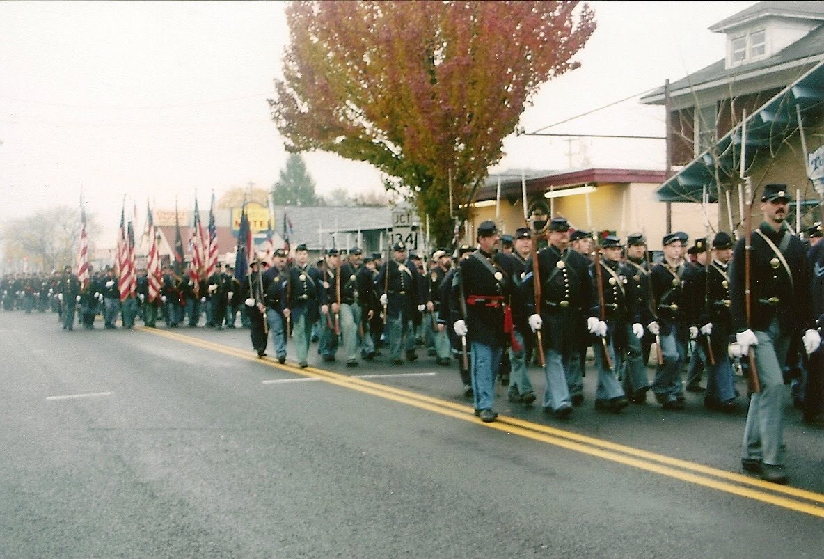 | Long lines of Union soldiers parade through the streets of Gettysburg |