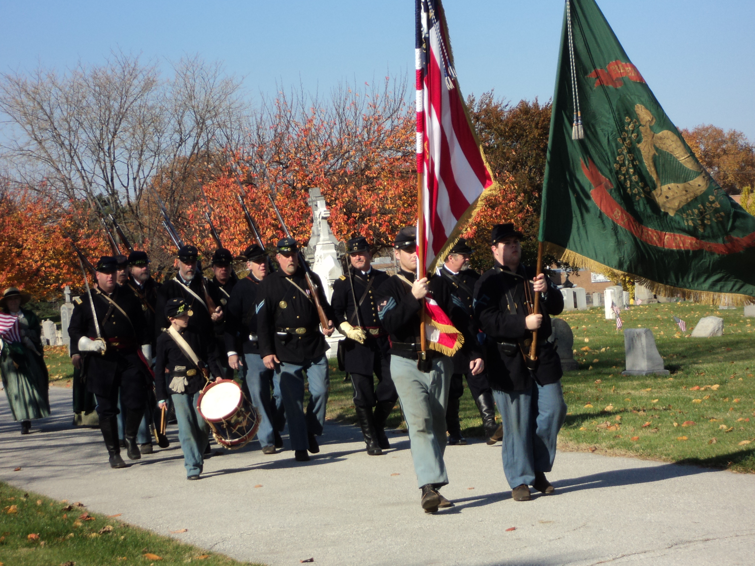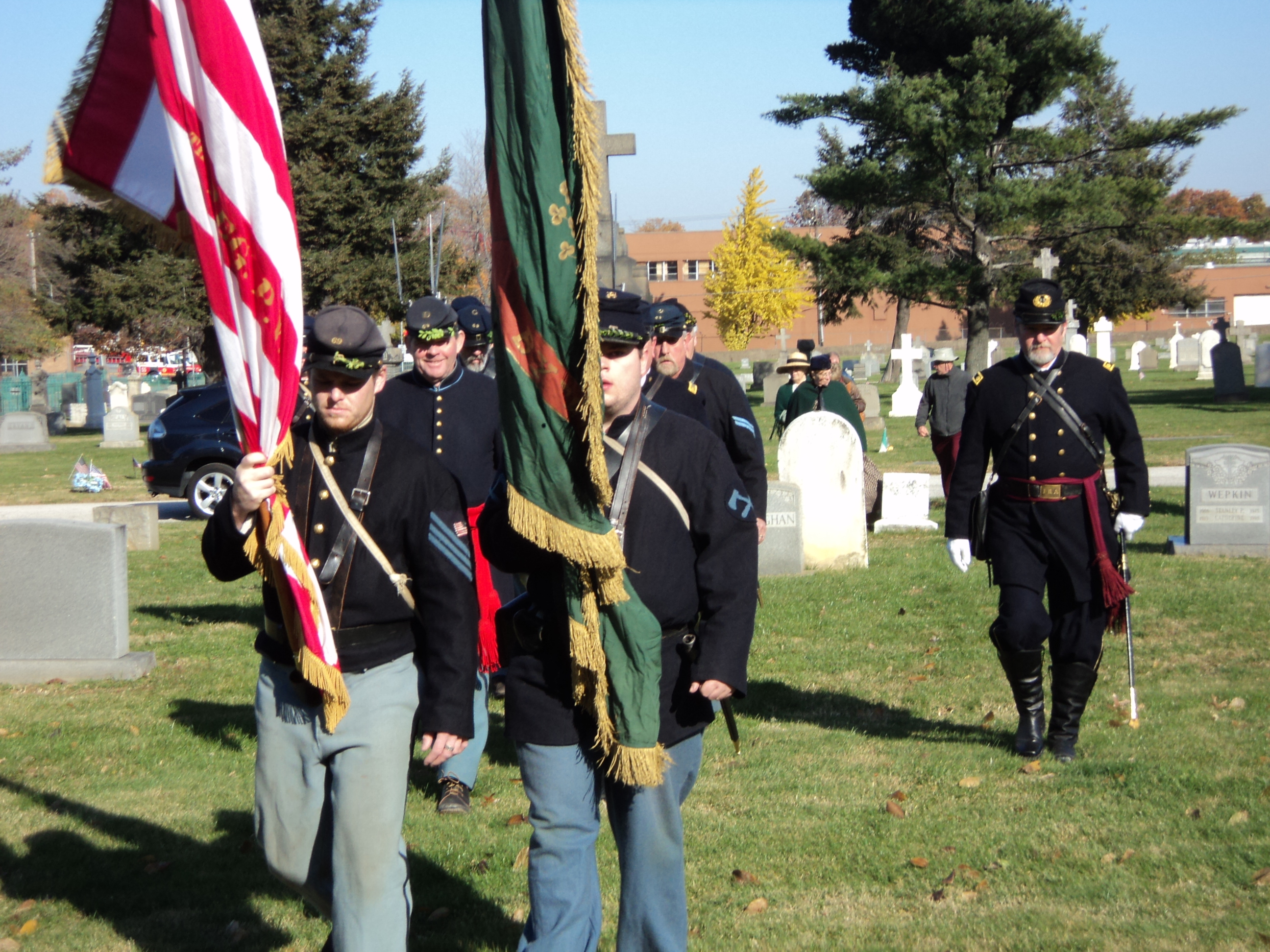 | The "Nationals" and the Irish green battleflag wave in the wind as the regiment enters the cemetery |