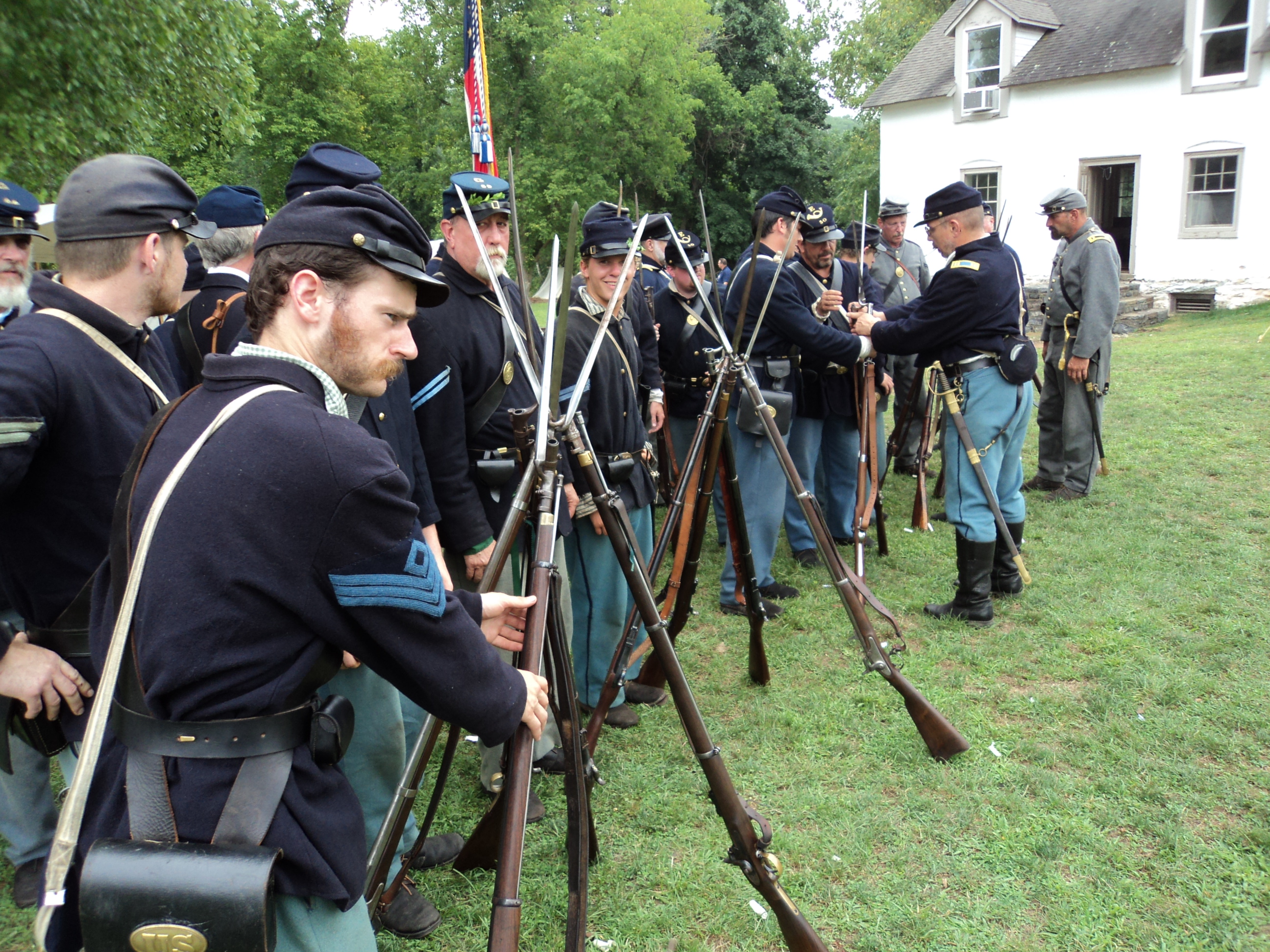 Rifles are stacked while we await the word of the scouts before marching into battle