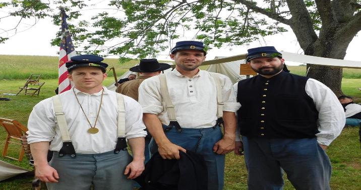 recruits and friends together beneath the shade of the trees. Reenactments are both